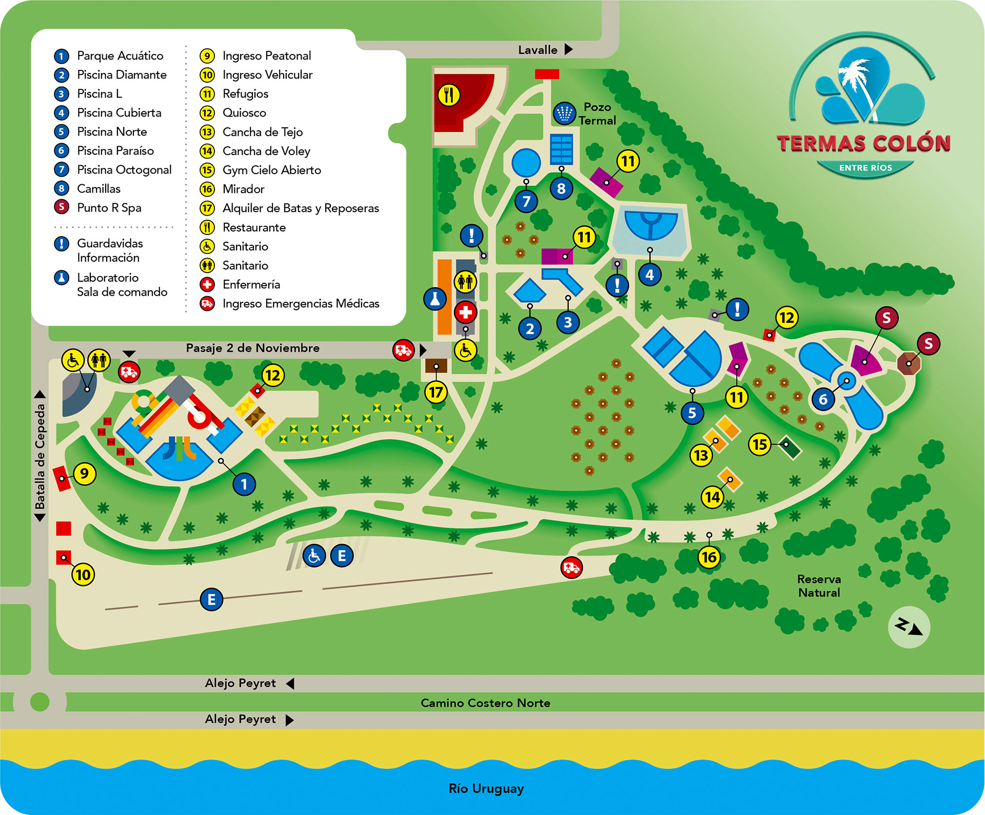 El “COMPLEJO TERMAL COLÓN” está emplazado en un predio de 4,5 hectáreas a metros del Río Uruguay, cuenta con 5 sectores de piscinas y sus respectivos refugios totalmente cubiertos, vidriados y resguardados, ideales para toda época del año. Las piscinas en total son trece: 9 al aire libre, 3 cubiertas y además otras dos semicubiertas, siendo la octogonal y el sector exclusivo de relax con ocho camas individuales con hidrojet. Todas son de fácil accesibilidad, con cómodos asientos dentro de las piscinas y espacios de descanso. Las temperaturas oscilan entre los 32° y 40°.